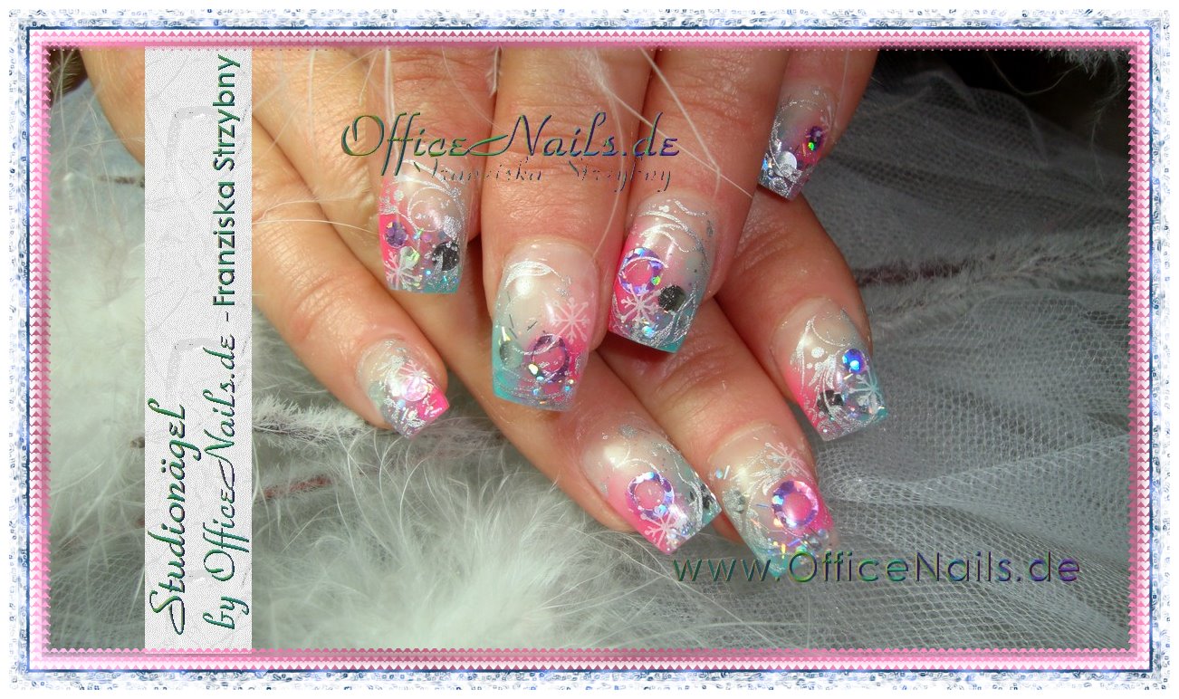 Pinkes French hier mit apricot und Glitter, zarte Ranken oben auf.